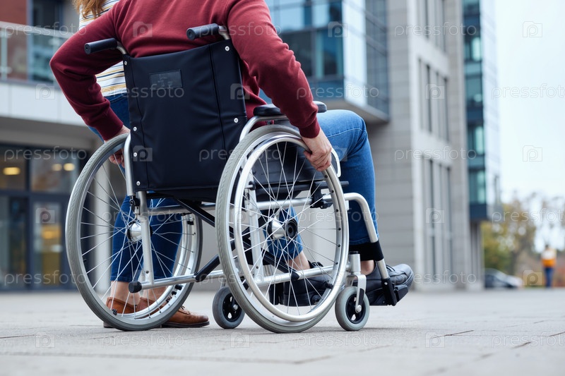 Мужчина среднего возраста с инвалидностью, ориентирующийся в инвалидной коляске на открытом воздухе
