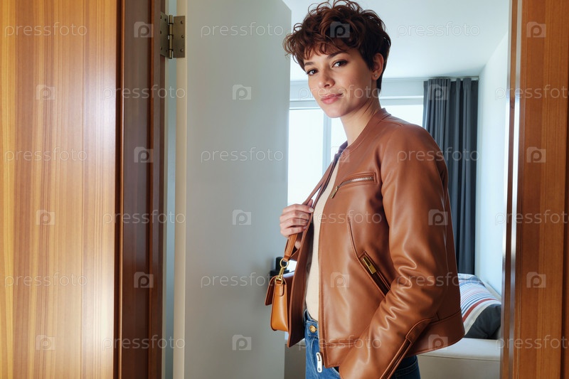 Портрет молодой женщины, входящей в современную спальню с улыбкой