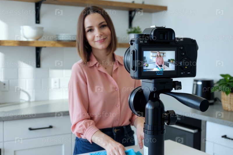 Портрет молодой женщины записывает видео приготовления пищи на кухне