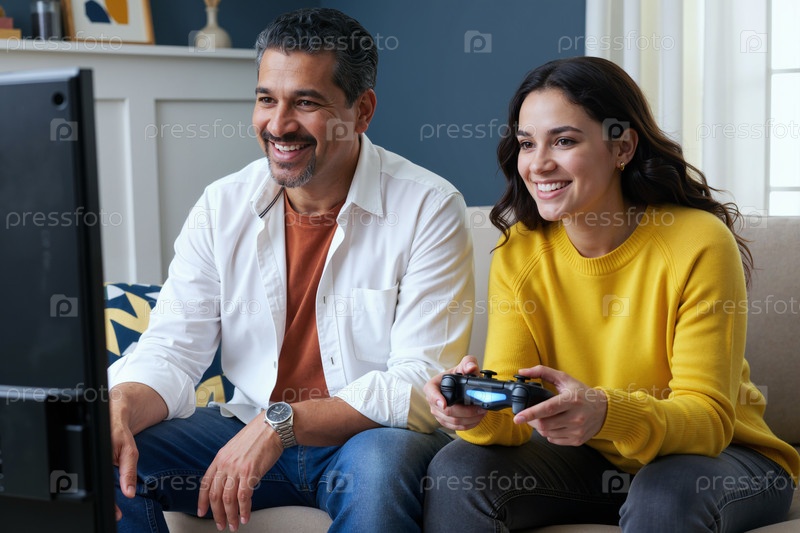 Юный испаноязычный мужчина и женщина играют в видеоигры вместе на диване