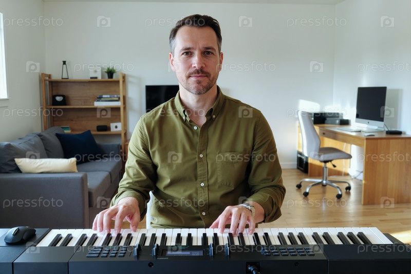 Портрет молодого человека, играющего на цифровом пианино в домашнем офисе