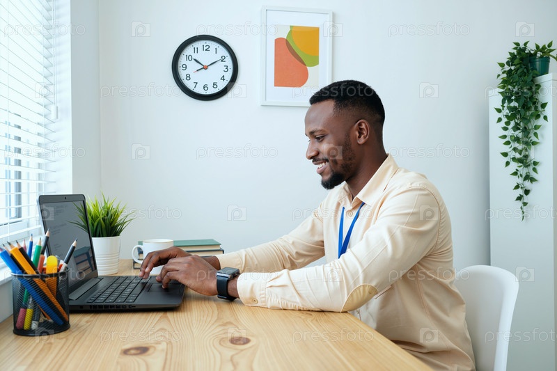 Молодой чернокожий мужчина работает на ноутбуке в офисной среде