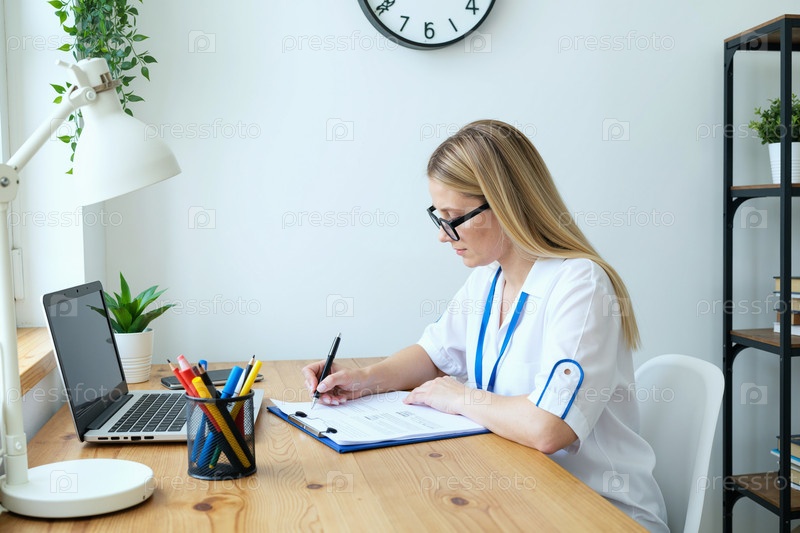 Молодая женщина, работающая за столом и пишущая документы в офисе