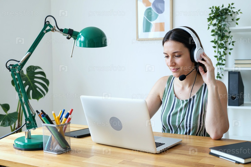 Молодая женщина, носящая наушники работает удаленно в офисе
