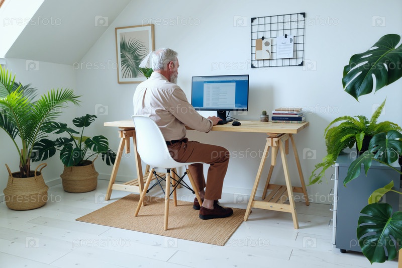 Старший мужчина, работающий на компьютере в офисной среде