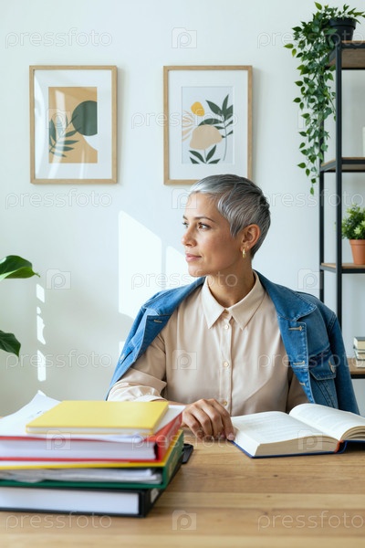 Взрослая женщина сидит за рабочим столом, читает книгу в офисе