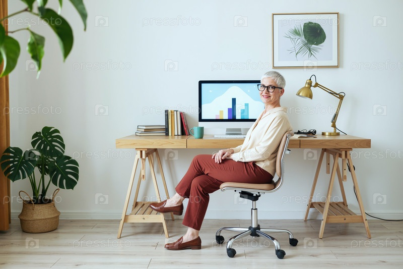 Портрет старшей женщины, сидящей за рабочим столом и работающей в офисе