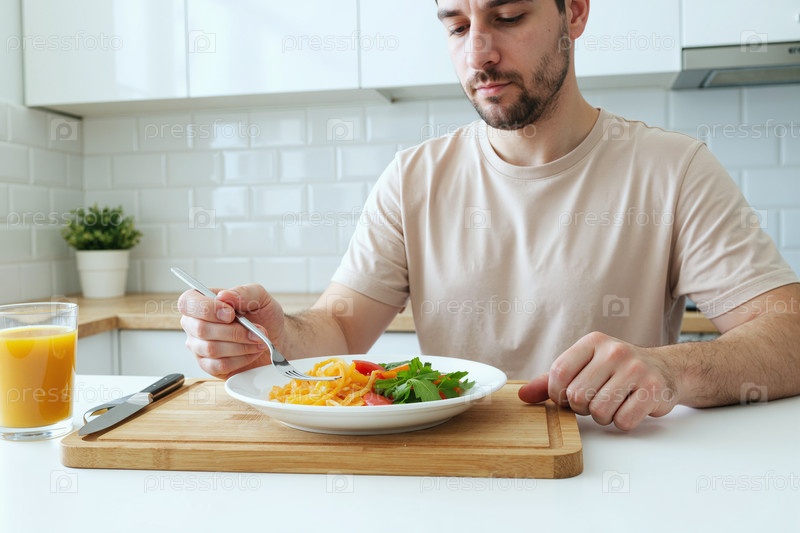 Молодой человек ест макаронный салат во время офисного обеденного перерыва