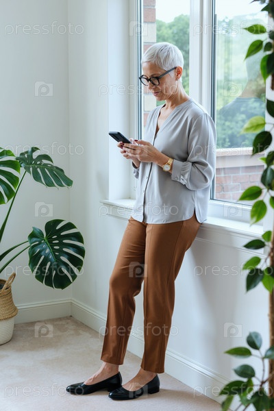 Взрослая женщина, использующая смартфон, стоит возле офисного окна