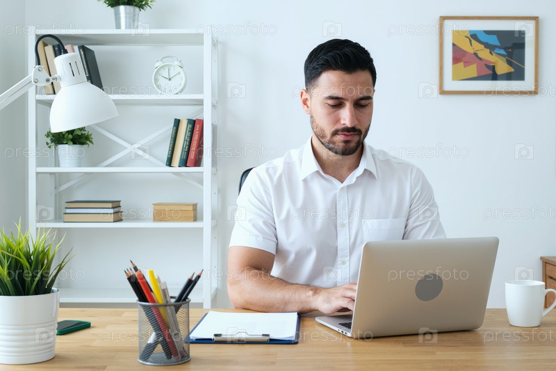 Молодой человек работает на ноутбуке в офисной среде