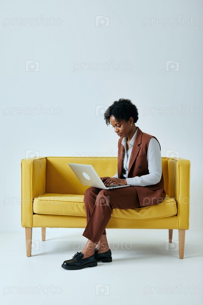 Молодая чернокожая женщина сидит на диване, работает на ноутбуке в офисе