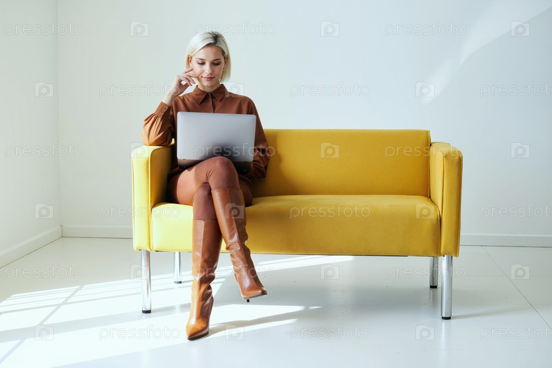 Молодая женщина, сидящая на желтом диване с помощью ноутбука для бизнеса