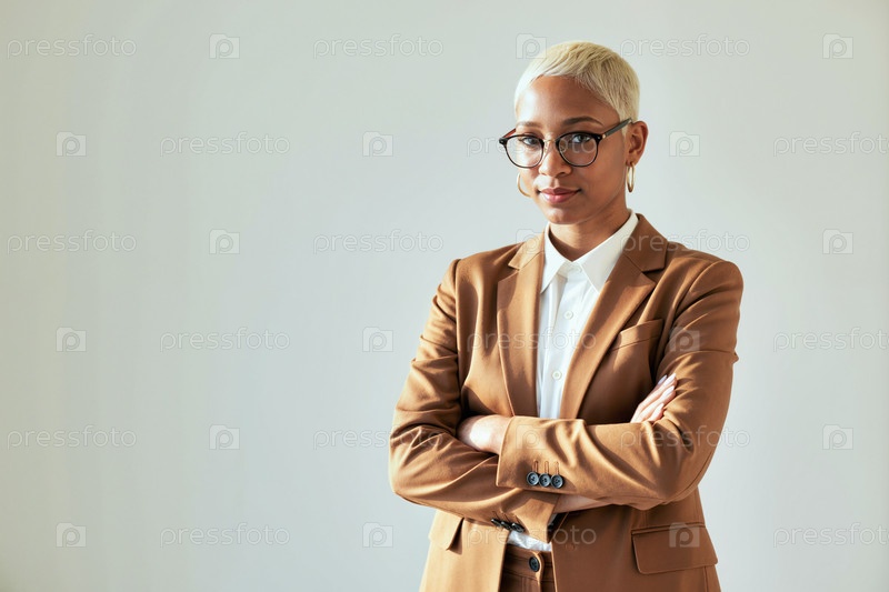 Портрет молодой чернокожей женщины в очках, стоящей с перекрещенными руками