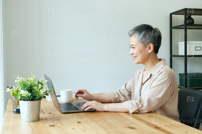 Взрослая азиатская женщина работает на ноутбуке и пьет кофе в офисе