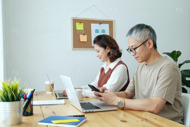 Взрослый азиатский мужчина и молодая азиатская женщина работают в офисе