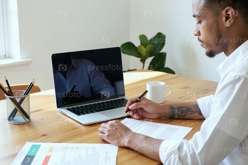 Молодой чернокожий мужчина работает с документами на рабочем столе в офисе, используя ноутбук