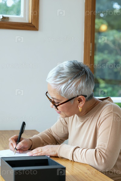 Старшая женщина пишет документ за столом в офисе