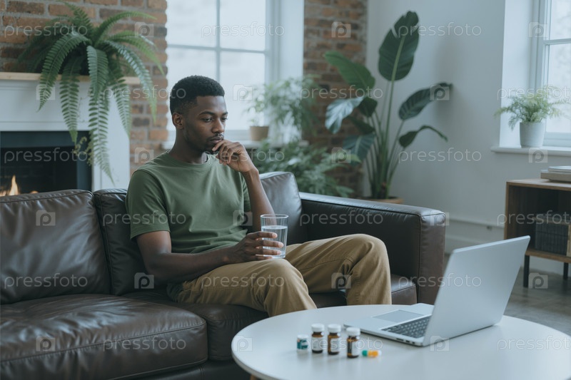 Молодой чернокожий мужчина сидит на диване Консультирующий врач Онлайн держит лекарства