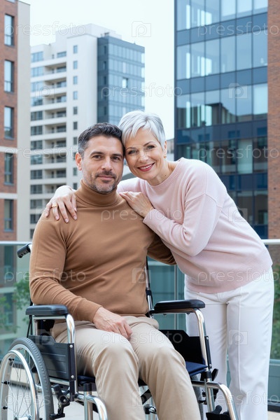 Мужчина с инвалидностью сидит в инвалидной коляске со взрослой женщиной, улыбающейся