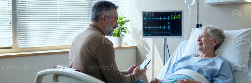 Мужчина утешает пожилую женщину в больничной постели