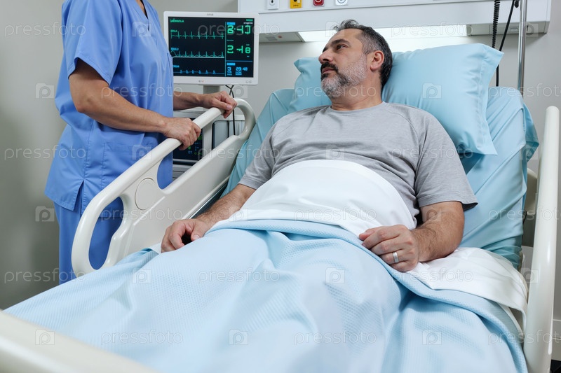 Мужчина, получающий медицинскую помощь от медсестры в больничной постели