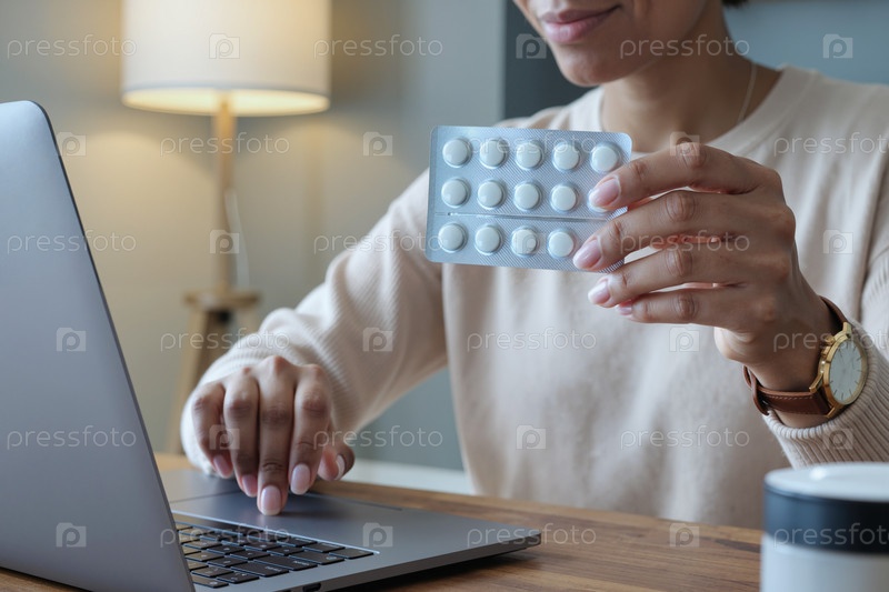 Молодая женщина держит пузырь пакет таблеток во время использования ноутбука