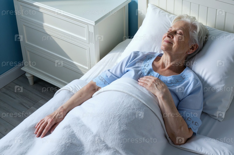 Пожилая женщина спокойно отдыхает в постели, получая медицинскую помощь