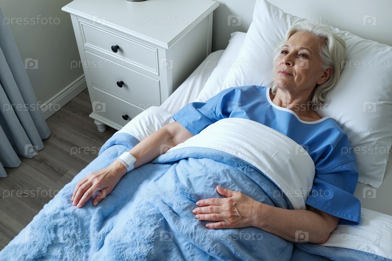 Пожилая женщина лежит в больничной постели, восстанавливается после медицинской процедуры