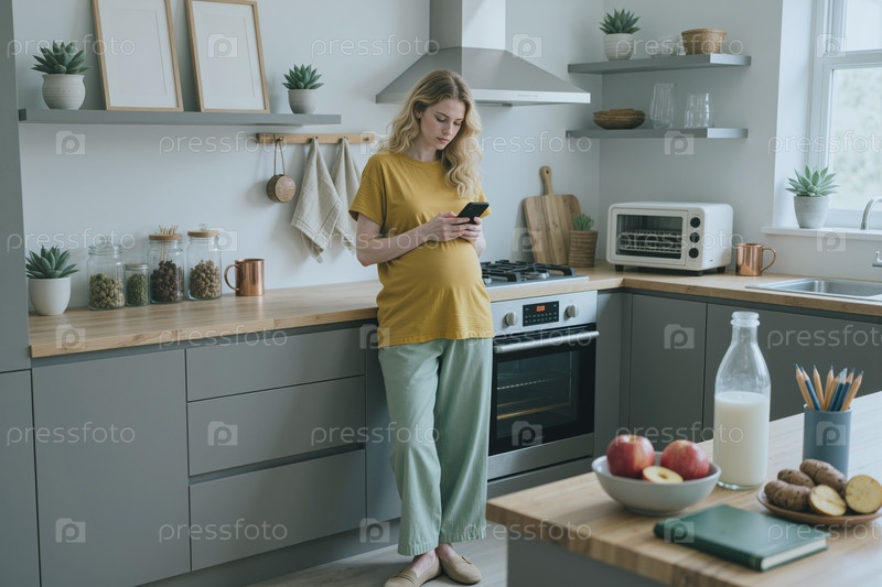 Беременная молодая женщина использует смартфон на кухне во время беременности
