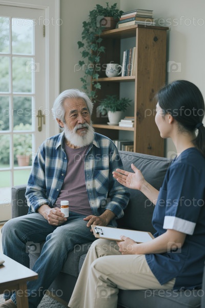 Старший азиатский мужчина консультирует медсестру о лекарствах во время медицинского посещения