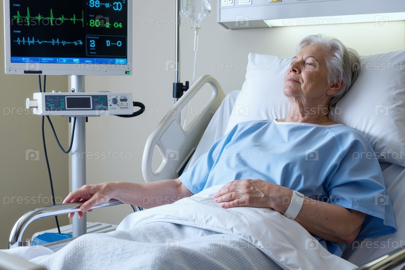 Пожилая женщина отдыхает в больничной постели во время мониторинга медицинской помощи