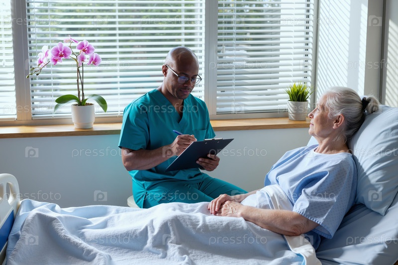 Взрослый чернокожий мужчина медсестра консультирование старшая женщина в больничной постели