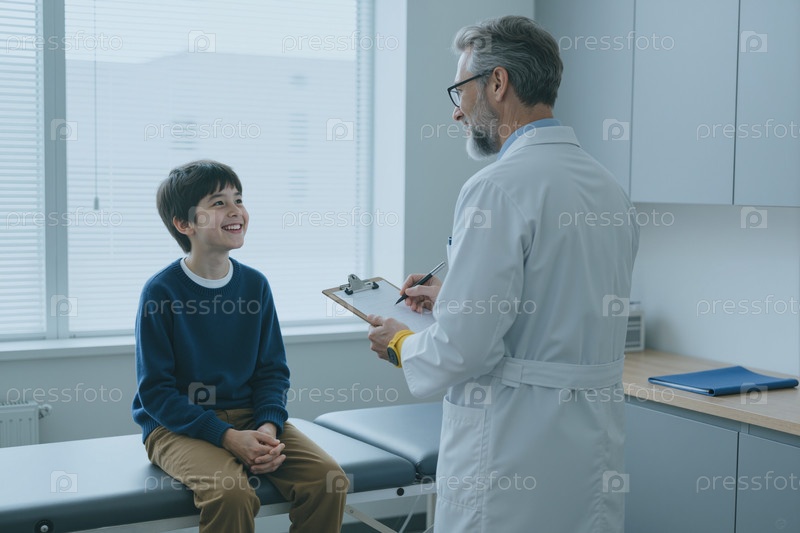 Взрослый мужской врач консультирует улыбающегося ребенка-пациента в клинике