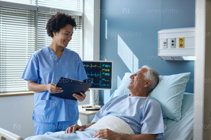 Взрослый мужчина улыбается, разговаривая с чернокожей медсестрой