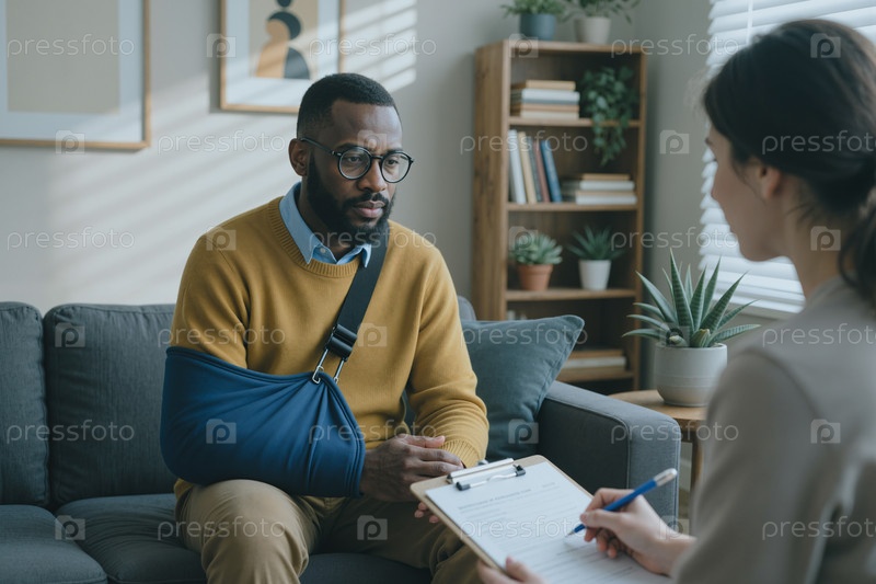 Молодой чернокожий мужчина консультирует женщину-врача по поводу травмы руки в медицинском обслуживании