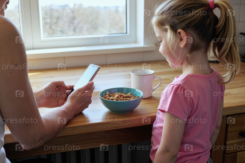 Женщина использует смартфон, пока молодая девушка ждет завтрака