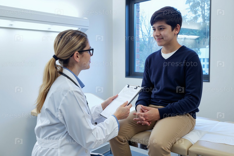 Женщина-врач консультирует испаноязычного подростка во время медицинского осмотра