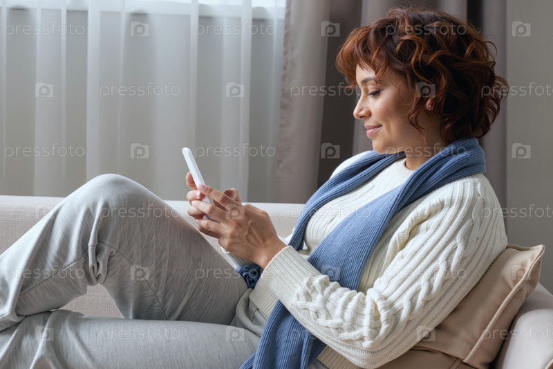 Молодая женщина с помощью смартфона отдыхает в помещении во время медицинской помощи