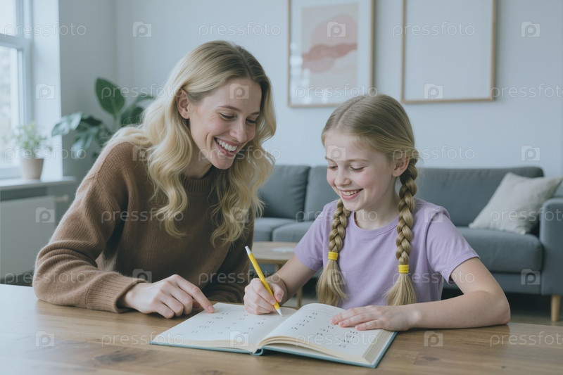 Молодая женщина помогает девочке с домашними заданиями дома