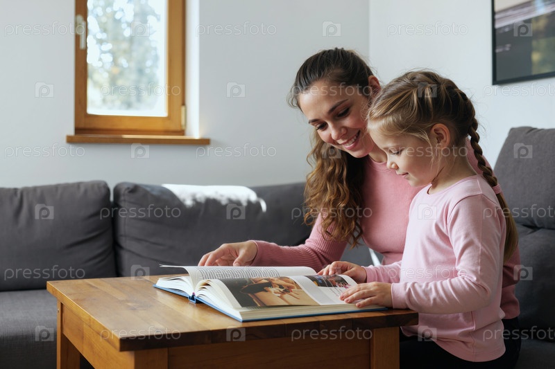 Молодая женщина помогает ребенку девочке читать медицинскую книгу