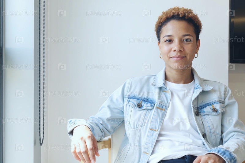 Портрет молодой чернокожей женщины, сидящей в медицинском учреждении и улыбающейся