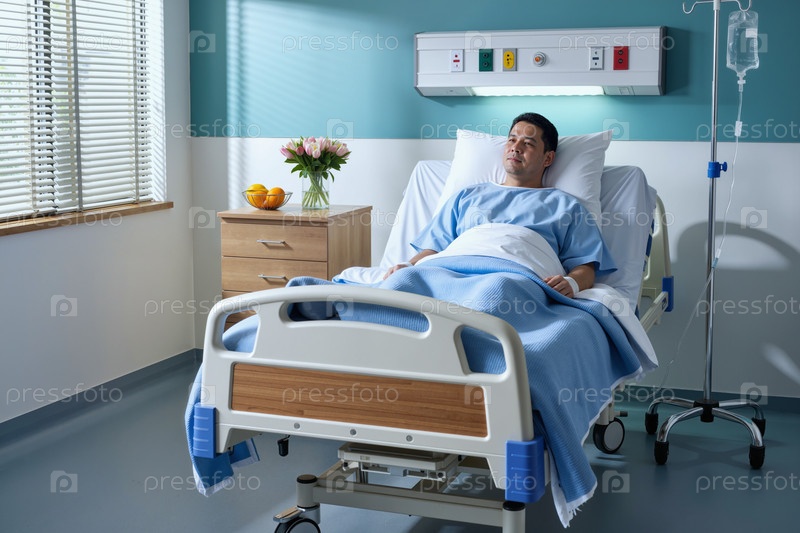 Взрослый мужчина, восстанавливающийся в больничной постели во время медицинской помощи