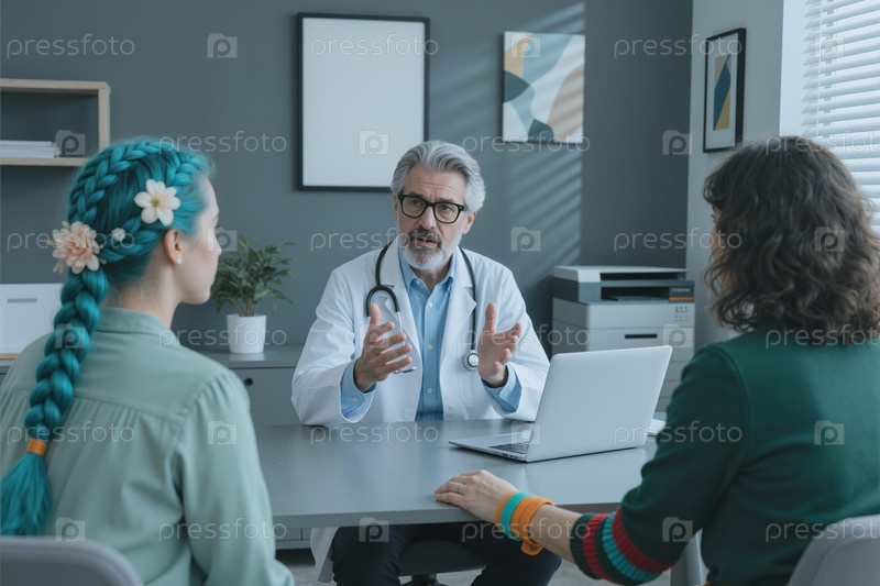Взрослый мужской врач консультирует молодых женщин в медицинском кабинете