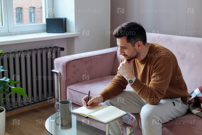 Молодой человек сидит на диване, пишет заметки во время медицинской консультации