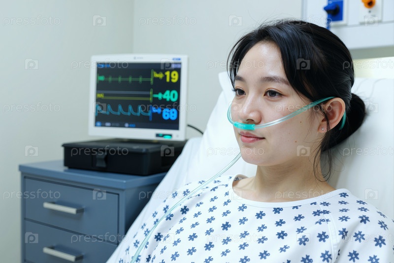 Молодая азиатская женщина получает кислородную терапию во время медицинского мониторинга