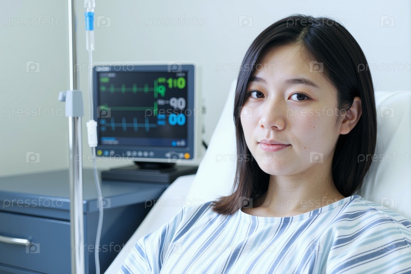 Портрет молодой азиатской женщины, получающей медицинскую помощь в больничной палате