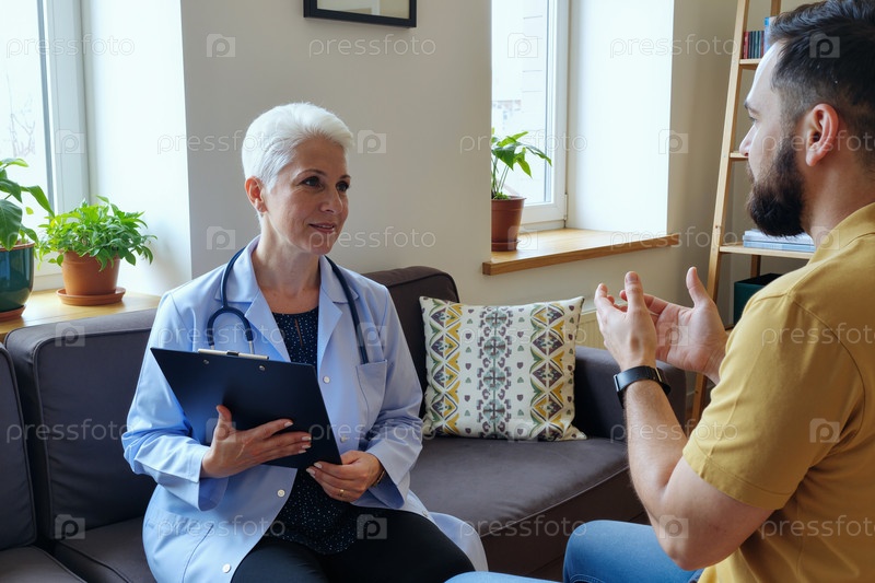 Старшая женщина-врач консультирует молодого человека во время медицинской встречи