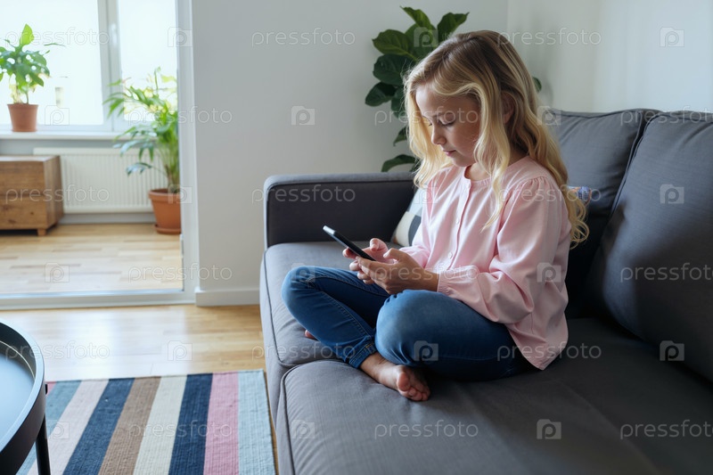 Девушка, сидящая на диване с помощью смартфона для медицинской помощи
