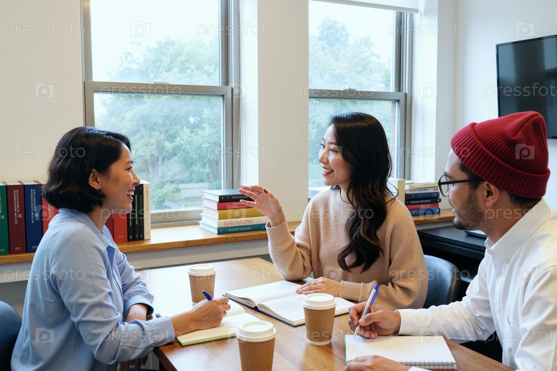 Молодые люди сотрудничают во время учебной сессии в библиотеке