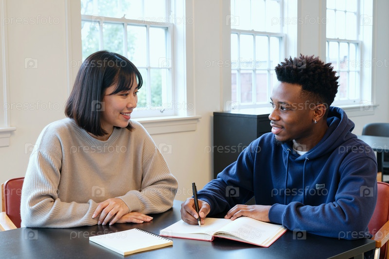 Молодая азиатская женщина и молодой чернокожий мужчина учатся вместе в классе